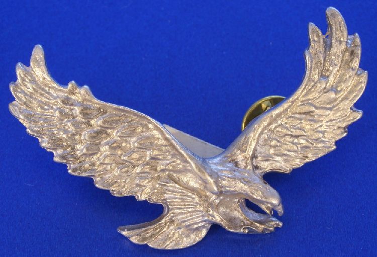 Dieser wunderschöne Adler ist nach links zum Herzen ausgerichtet. Auf Wunsch können wir dieses majestätische Tier auch als Anstecker für eine Biker Lederjacke fertigen.