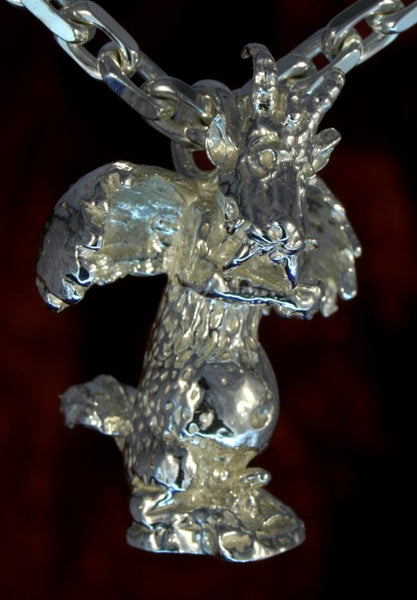 Der Wolperdinger ist ein Fabelwesen, dass vor allem in den bayrischen Wäldern schon oft gesehen, aber nie gefangen wurde. Das hier zu sehende Exemplar ist besonders selten. Er hat vor allem die Aufgabe als Schutzengel zu dienen. Sein Ziegenbock-Kopf zeigt, dass er dieser Aufgabe auch mit Nachdruck (in bayrisch "Sturheit") nachkommt. Besonders zu empfehlen für männliche Träger, die doch oft mehr Schutz durch Ihre Aktivitäten und Risikofreude benötigen.